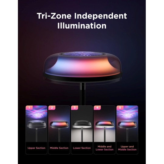 Trojité zónové osvetlenie umožňuje individuálne nastavovať spodnú, strednú a hornú časť lampy podľa vašich potrieb. Spodná LED poskytuje praktické každodenné svetlo, stredná zóna jemne osvetľuje priestor a horný projekčný efekt pridáva dramatický vizuálny zážitok. Vďaka tomuto systému môžete vždy vytvoriť dokonalú atmosféru pre každú príležitosť.