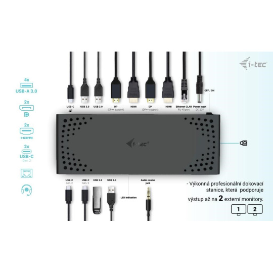 Výkonná kancelárska dokovacia stanica s podporou superrýchlych portov USB Gen 2. Dokovacia stanica podporuje výstup až na dva externé monitory vo vysokom rozlíšení až 4K. Dokovaciu stanicu je možné prakticky použiť so všetkými notebookmi, pretože podporuje pripojenie ku všetkým bežným portom: 3.0, USB-C a Thunderbolt 3/4 a zároveň podporuje všetky bežné súčasné operačné systémy.