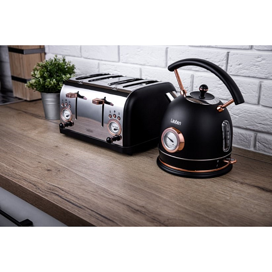 Dokonalou dvojici tvoří topinkovač s rychlovarnou konvicí Lauben Kettle 17BC s ukazatelem teploty ve stejném designu.