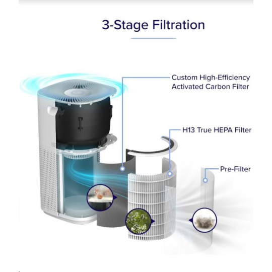 Druhou vrstvou je HEPA filter H13. To odlišuje Levoit od konkurencie, pretože filter HEPA H13 je oveľa kvalitnejší a spoľahlivejší než bežne používané HEPA H11. Tu sa odfiltrujú jemné prachové častice, pleseň, baktérie, peľ, dymové častice, roztoče a srst.