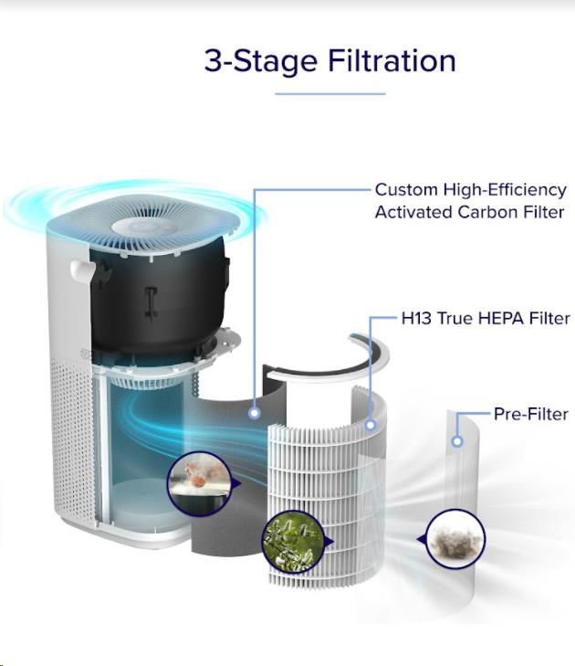 Druhou vrstvou je HEPA filter H13. To odlišuje Levoit od konkurencie, pretože filter HEPA H13 je oveľa kvalitnejší a spoľahlivejší než bežne používané HEPA H11. Tu sa odfiltrujú jemné prachové častice, pleseň, baktérie, peľ, dymové častice, roztoče a srst.