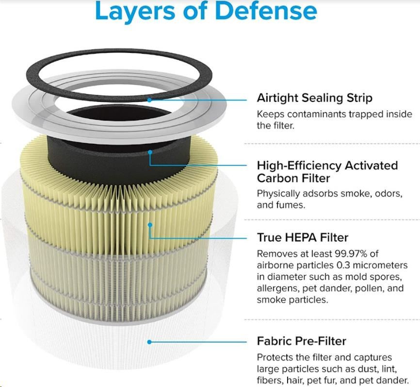 Druhou vrstvou je HEPA filter H13. To odlišuje Levoit od konkurencie, pretože filter HEPA H13 je oveľa kvalitnejší a spoľahlivejší ako bežne používané HEPA H11. Tu sa odfiltrujú jemné prachové častice, pleseň, baktérie, peľ, dymové častice, roztoče a srsť.