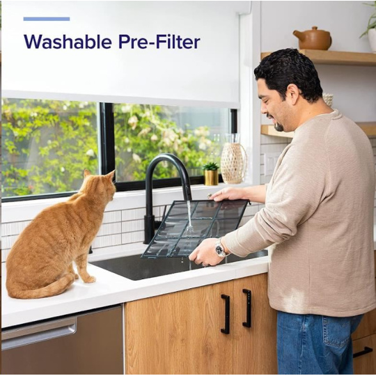 Konštrukcia umožňuje používateľom ľahko vybrať predfilter a vyčistiť ho, kedykoľvek je to nutné, namiesto častej výmeny ako pri jednorazových filtroch. Možnosť filter zbaviť tých najhrubších nečistôt umytím nielenže dlhodobo šetrí peniaze, ale taktiež znižuje množstvo odpadu, vďaka čomu je Levoit Vital 200S PRO šetrný k životnému prostrediu. Pri dôkladnom umývaní a udržiavaní predfiltra postačí meniť filter raz ročne (za bežnej prevádzky, v závislosti od podmienok).