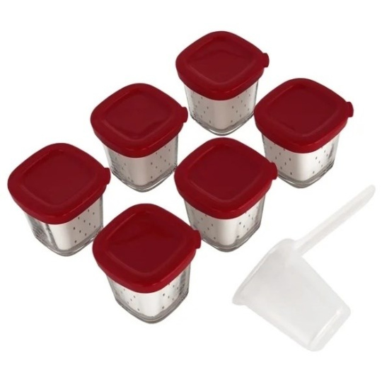 Súčasťou balenia je 6 nádob po 140 ml s viečkom a sitkom, ako aj podnos s úchytmi, ktoré je možné použiť na uloženie 6 pohárov pre jednoduchú prepravu v chladničke. Môže sa umývať v umývačke riadu a 100% neobsahuje BPA