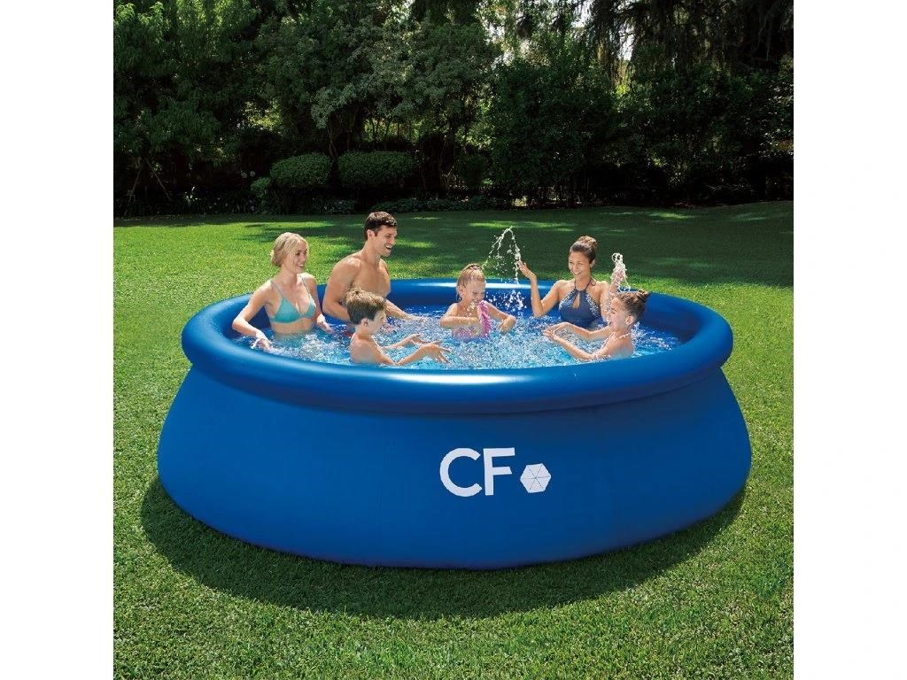 Pripravte sa na teplé počasie a nekonečné hodiny vodných radovánok na vlastnej záhrade so samonosným nadzemným bazénom CF QUICK. Tento nadzemný bazén v modrej farbe je navrhnutý pre jednoduchú montáž a môže byť pripravený počas niekoľkých minút. Stačí len pripraviť správne miesto na bazén, rozprestrieť bazénovú podložku, rozbaliť bazén, nafúknuť prstenec a napustiť vodu. Stúpajúca voda bazén sama postaví. Tento kruhový nadzemný bazén s priemerom 366 cm je ideálny pre celú rodinu a vďaka absencii pevných prvkov je vhodný aj pre menšie deti (deti musia zostať pod dohľadom dospelej osoby). Bazén je vyrobený z odolných a super pevnych PVC materiálov, aby bolo zaistené, že zostane stáť aj pri všetkej zábave, ktorú tento bazén ponúka.