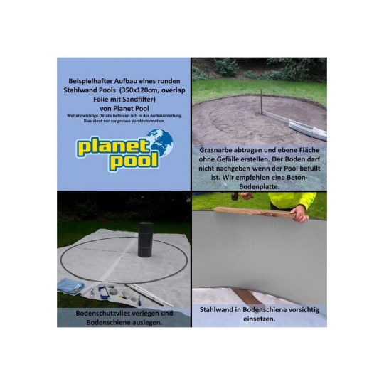 Bazén sa inštaluje pomocou spodných a horných líšt, do ktorých sa zasúva oceľová stena. Oba konce steny sa prepoja pomocou vnútorných a vonkajších líšt a skrutiek. Mrazuvzdornú fóliu sa pomocou ohybu upevní na hornú časť oceľovej steny a vytvaruje do bazéna podľa vizuálnych požiadaviek. Fólia je flexibilná a na mieru vyrobená pre tento typ bazéna (nie je potrebná žiadna úprava). Pre montáž krok za krokom sledujte pokyny v montážnom návode.
