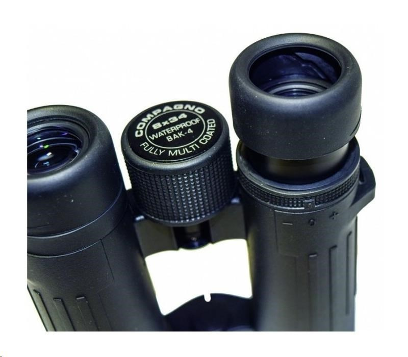 Kompaktný ďalekohľad COMPAGNO 8x34, zväčšenie 8x, predná šošovka 34mm, zorné pole 124m, ostré od 4m, optický výstup 4,2mm, vzdialenosť stredu očí 56-74mm s odstupom 17,4mm, svetelnosť 17,6, stmievivosť 10,9, rozmery 130x126x45 mm, hmotnosť 450g, čierny. Kompaktné ďalekohľady DCF so strešovými hranolmi BaK4 - ROOF (DACH). Modelová rada s moderným dizajnom, malými rozmermi, nízkou hmotnosťou a vysokou optickou kvalitou pre kontrastný pohľad aj pri zhoršených svetelných podmienkach. Výkonný a odolný ďalekohľad s Fully Multicoated úpravou, hranoly z BaK4 skla, vodoodolný do 0,5m/15min s ochranou proti zahmlievaniu plnením dusíkom, vhodný aj pre sledovanie s okuliarmi, nastavenie +/-4 dioptrií, výsuvné kryty okulára, statívový závit, pogumované telo z ABS. Vrátane textilného puzdra, popruhu a čistiaceho handričky. Malý, ale maximálne výkonný ďalekohľad do vrecka pre turistiku.