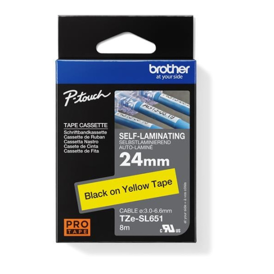 Samolepiaca páska TZe-SL651 s dĺžkou 24 mm s čiernym tlačom na žltej bola vyvinutá pre dlhodobú identifikáciu sieťových káblov. Má špeciálne lepiace vlastnosti štítkov pre trvanlivé pevné obitisovanie okolo vašich vodičov a káblov. Kompatibilné s niektorými modelmi P-touch, ktoré používajú pásky TZe 24 mm a 36 mm.