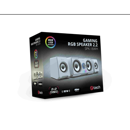 Kompaktné PC reproduktory C-tech SPK-16WH 2.2 vám sprostredkujú kvalitný zvuk s výkonom 16W a frekvenčným rozsahom 150-20kHz. Vďaka unikátnej kombinácii meničov 2+2 je reprodukovaný zvuk bohatší a viac dynamický, takže si ho využijete nielen pri počúvaní obľúbených skladieb, ale aj pri hraní hier. O jedinečnú atmosféru pri počúvaní hudby sa postará automatické RGB podsvietenie. K ovládaniu hlasitosti poslúži regulátor nachádzajúci sa na jednom z reproduktorov. Tento regulátor slúži na zapnutie a vypnutie zariadenia. Pripojenie sústavy k zariadeniam zabezpečí kábel s 3,5mm jackom, napájanie zase USB kábel.