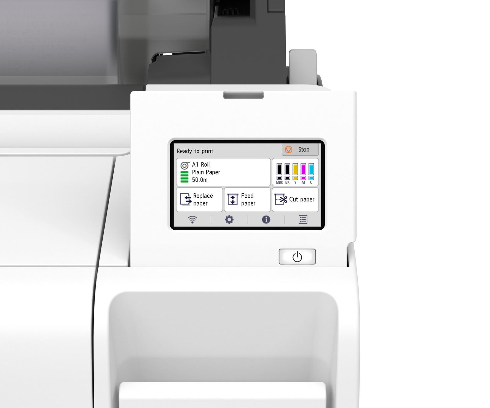 Funkčný dizajn 4,3" dotykového panelu umožňuje intuitívne zobrazenie pokynov a dôležitých informácií, ako je typ média, zostávajúce a množstvo atramentu. Kotúč papiera je možné ľahko vymeniť na hornom kryte s rovným povrchom.
