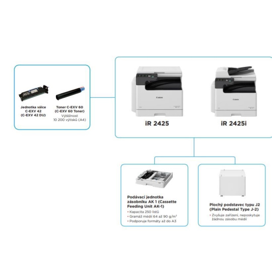 | Prídavný podávač papiera AK1 | Kapacita papiera: 1×250 listov (80 g/m2) Typ papiera: bežný, recyklované, farebné, perforované Veľkosť papiera: A3, A4, A4R, A5, B4, B5, B5R Hmotnosť papiera: 64 až 90 g/m2 Zdroj napájania: z hlavnej jednotky Rozmery (š × h × v): 581 × 575 × 92 mm Hmotnosť: cca,8 kg  |