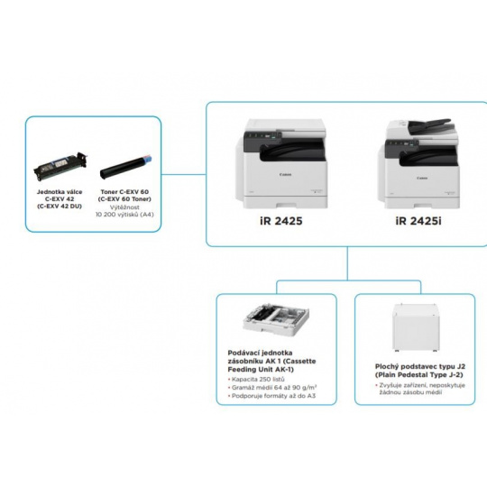 | Prídavný podávač papiera AK1 | Kapacita papiera: 1×250 listov (80 g/m2) Typ papiera: bežný, recyklované, farebné, perforované Veľkosť papiera: A3, A4, A4R, A5, B4, B5, B5R Hmotnosť papiera: 64 až 90 g/m2 Zdroj napájania: z hlavnej jednotky Rozmery (š × h × v): 581 × 575 × 92 mm Hmotnosť: cca,8 kg |
