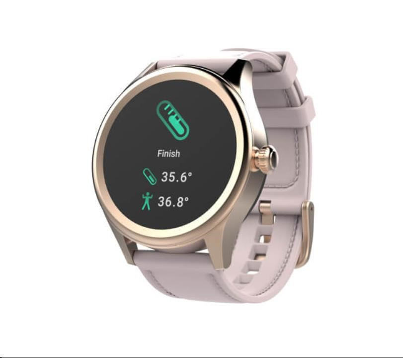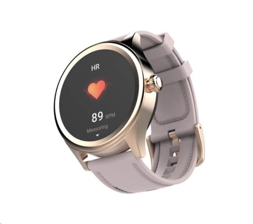 Smart hodinky Carneo Prime GTR v elegantnom zlatom prevedení, farebným dotykovým displejom je možné aktivovať jednoduchým otočením ruky. Okrem bežných "smart" funkcií disponujú aj fitness športovými funkciami a to všetko v elegantnom business look prevedení. Rosegold silikónový remienok v dizajne koženého páska s prešívaním umocňuje ich eleganciu.