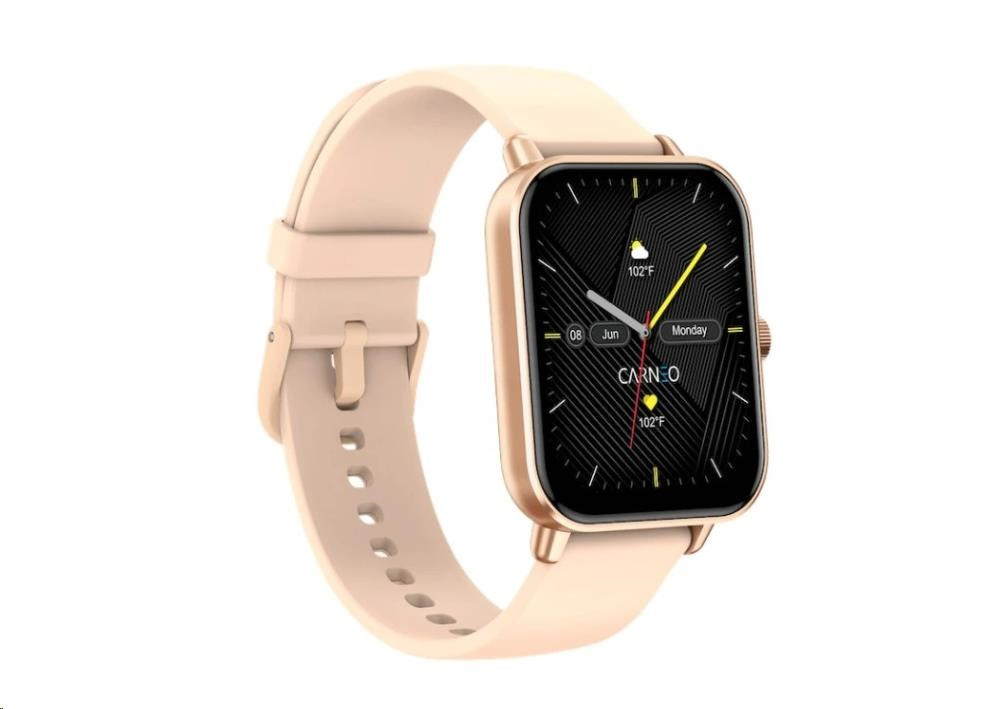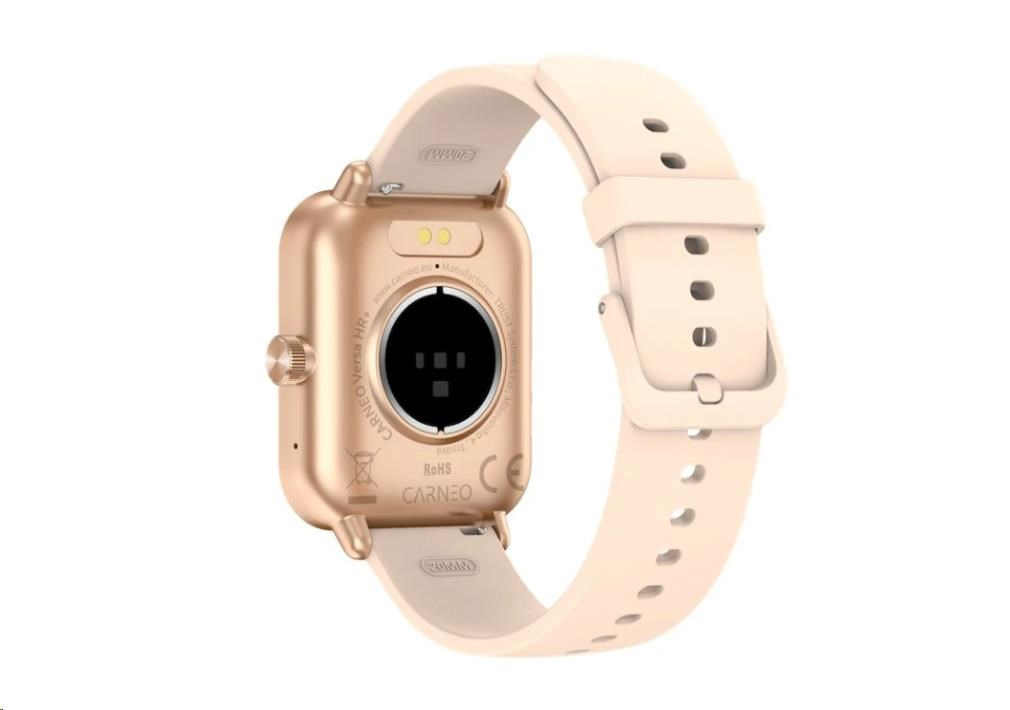 Moderné fitness hodinky Carneo Versa HR+ v elegantnom ružovozlatom prevedení sú vybavené farebným displejom IPS, ktorý možno aktivovať len otočením zápästia. Merajú telesnú teplotu, krvný tlak, okysličenie krvi, srdcový tep, prejdenú vzdialenosť, monitorujú spálené kalórie a kvalitu spánku. Súčasťou je batéria s výdržou cca 3-5 dní. Podľa certifikácie IP67 sú odolné voči vode a prachu. Hodinky s podporou technológie Bluetooth sú kompatibilné s operačnými systémami iOS a Android. Silikónový remienok s kovovou sponou je príjemný na dotyk a zaručuje komfort počas celého dňa.