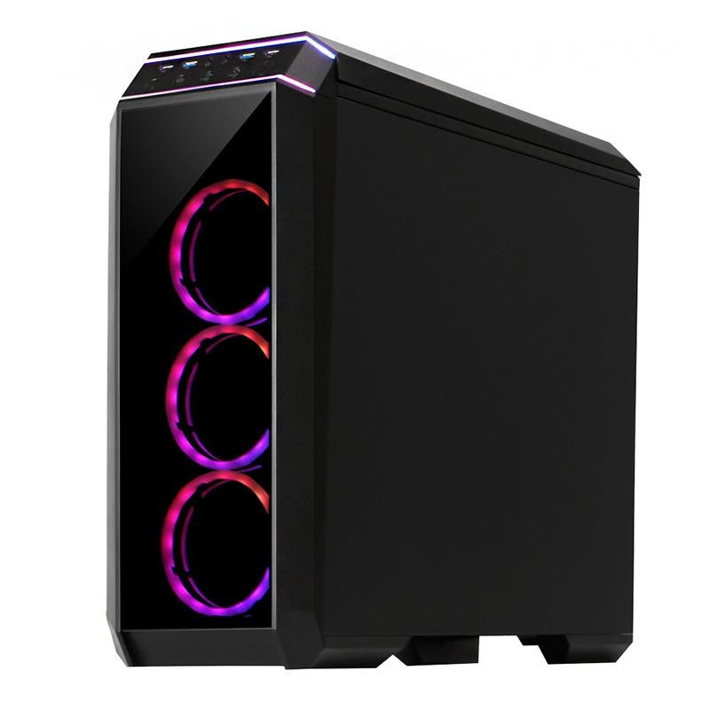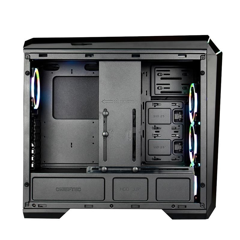 Špičková herná šasi CHIEFTEC STALLION II je vybavená bočnými a prednými panelmi z tvrdeného skla, čo zlepšuje prehľad o interiéri šasi a pozitívne odhaľuje ventilátory RGB RING a ďalšie osvetľovacie komponenty. 4 predinštalované 120mm ventilátory RGB RAINBOW RING sú ovládané jednotkou diaľkového ovládania, ktorá je súčasťou rozsiahleho "rozsahu dodávky". Sofistikovaný dizajn interiéru umožňuje integráciu ďalšieho 360 mm chladiča vodného chladenia do prednej časti, a tak táto druhá generácia herného šasi Chieftec spĺňa a prekonáva očakávania každého hráča.