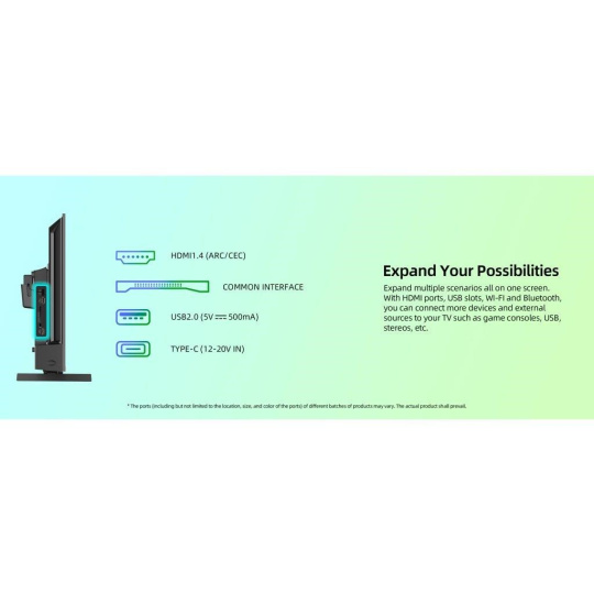 | Vstupy a výstupy: | USB-C, AV vstup mini, CI+, slúchadlový vstup 3.5 mm, digitálny audio výstup, HDMI 1.4, ARC CEC, USB 2.0, LAN, antény RF a LNB |