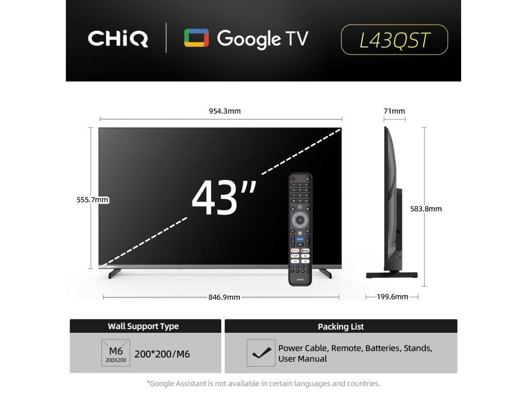 CHiQ 43“ L43QST, ultratenká bezrámečková QLED Smart Android 14 TV s HDR10, HLG, obrazovkou s Full HD s rozlíšením 1920 x 1080 pixelov, priestorovým zvukom Dolby Audio a dbx-tv.