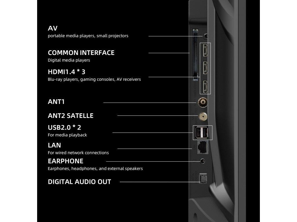| Vstupy a výstupy: | AV vstup mini, CI+, digitálny audio výstup, HDMI 2.1, USB 2.0, LAN, antény RF a LNB |