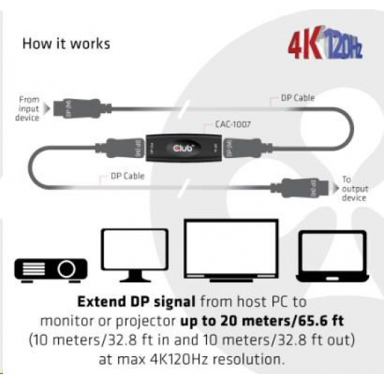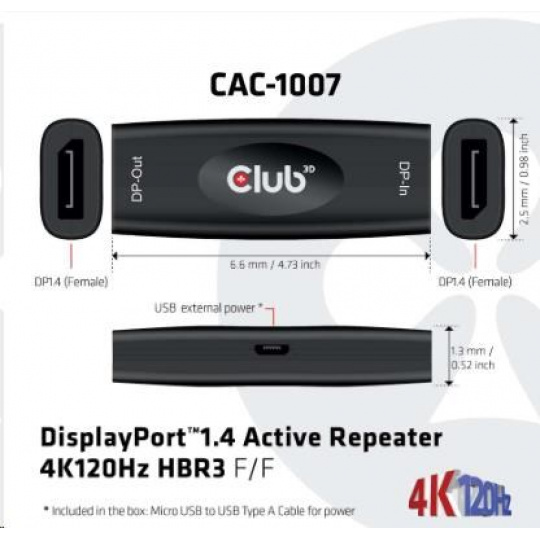 Club3D Adaptér aktivní DisplayPort 1.4 Repeater 4K120HZ HBR3 (F/F), černá