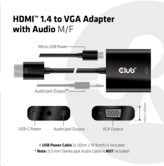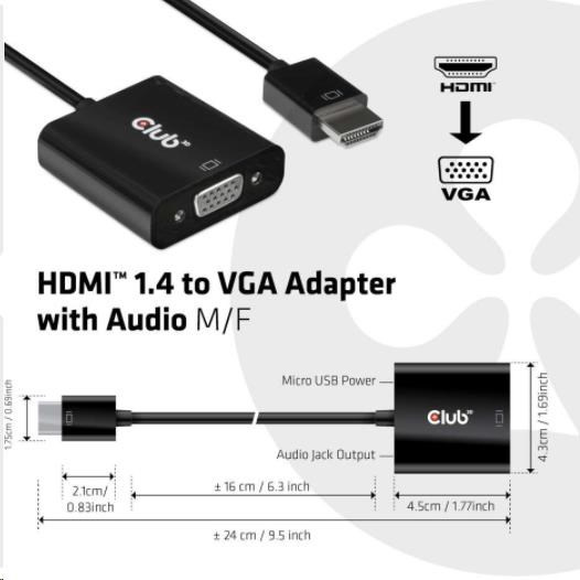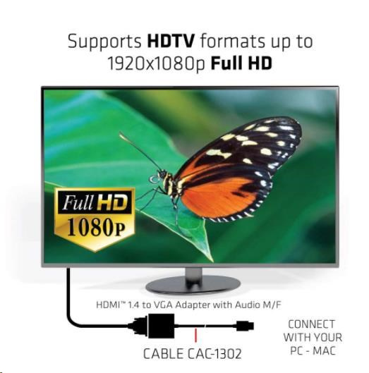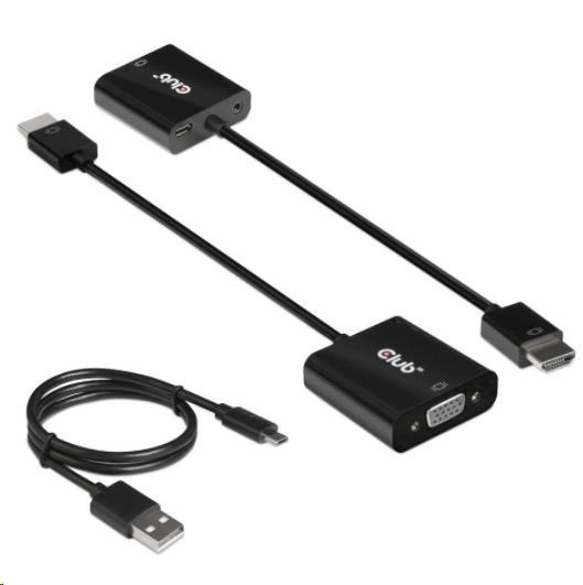 Club 3D CAC-1302 je aktívny HDMI™ 1.4 na prevodník signálu VGA. Umožňuje konvertovať digitálny signál HDMI™ na analógový signál VGA a extrahuje zvukový signál zo signálu HDMI™ prostredníctvom zvukového portu R/L.
