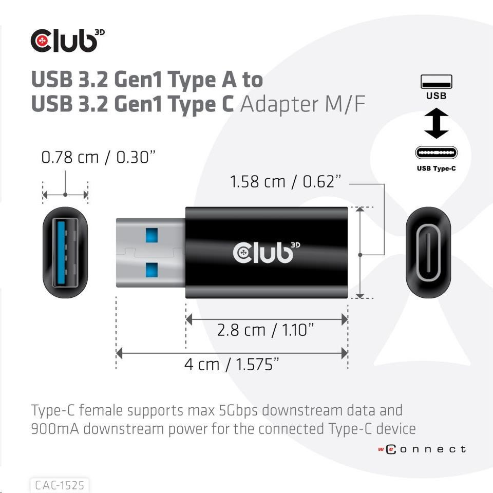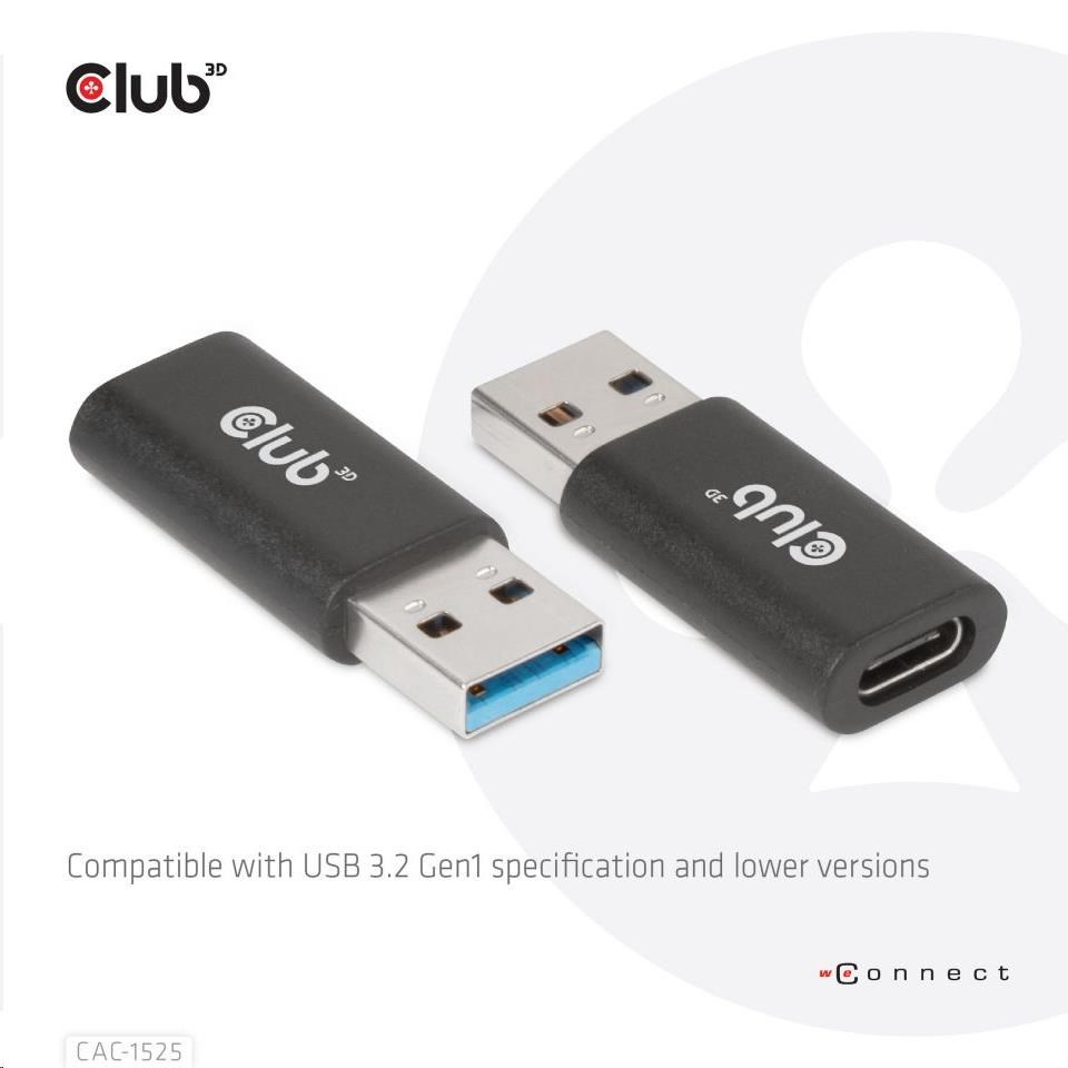 Adaptér Club3D USB 3.2 Gen1 typu A na USB 3.2 Gen1 typ C (M/F), čierna
