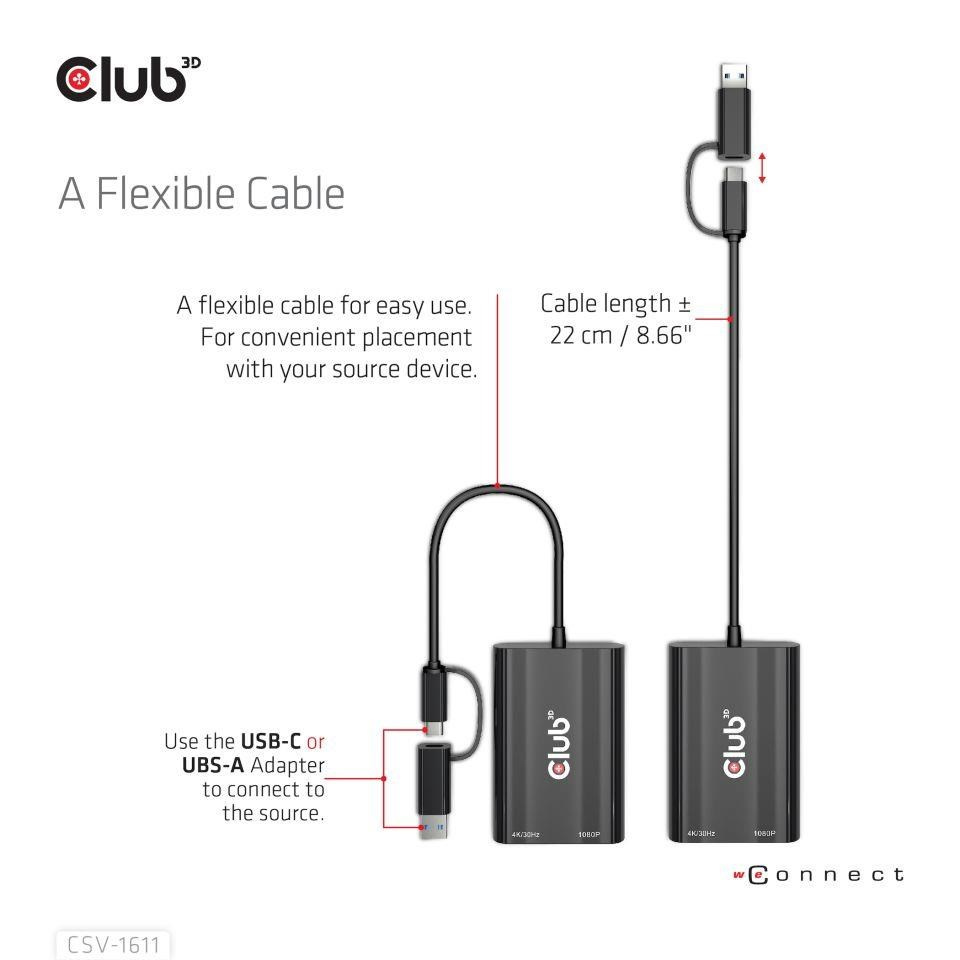 Adaptér Club 3D CSV-1611 USB Gen1 Type-C/-A na duálny HDMI™ (4K/30Hz) a VGA (1080/60Hz) je duálny adaptér, ktorý poskytuje najmodernejšie a najúčinnejšie riešenie na rozšírenie jedného portu USB Type-C alebo Type-A na displeje HDMI™ a VGA. Podporuje jeden HDMI™ 4K/30Hz a VGA 1080P/60Hz alebo duálny 4K/30Hz + VGA 1080P/60Hz simultánny výstup rôznych videí. Môže pracovať v režime USB a v režime DP Alt s podporou hostiteľa typu C a USB-A. Duálny video výstup na MacBooku s M1. Podporuje USB Gen1 s maximálnou rýchlosťou prenosu dát 5 Gb/s. Zariadenie sa napája prostredníctvom hostiteľského pripojenia USB typu A alebo typu C. Nie je potrebné žiadne externé napájanie.