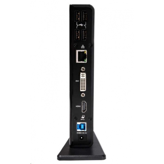 Vďaka čipu DisplayLink ™ DL-3900 je možné k dokovacej stanici pripojiť dva externé monitory s vysokým rozlíšením prostredníctvom výstupov HDMI ™ a DVI-I. Má ethernetový port RJ 45 pre spoľahlivé a rýchle drôtové pripojenie k sieti a ponúka celkom 6 portov USB pre periférie a pamäťové zariadenia, rovnako aj výstup zvuku a mikrofónu. To všetko je pripojené k vášmu zariadeniu pomocou jediného kábla USB.