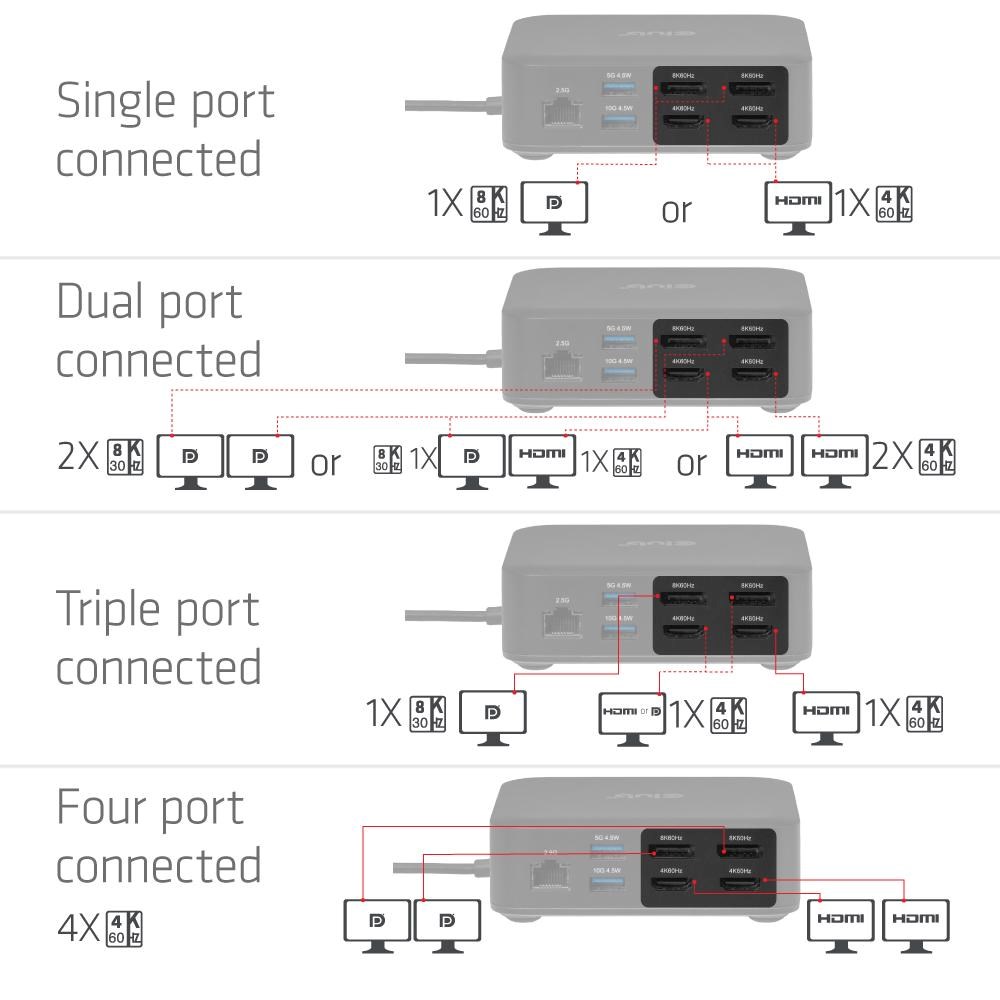 CSV-2542 je prvá dockovacia stanica, ktorá umožňuje pripojenie až štyroch 4K monitorov k akémukoľvek zariadeniu so systémom Windows alebo Mac iba prostredníctvom 10Gb/s USB rozhrania, a to aj u modelov, ktoré túto funkciu štandardne nepodporujú (napr. MacBook Air).
