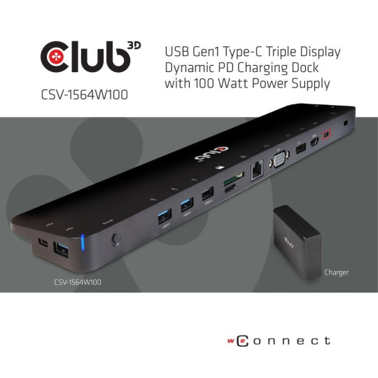 CSV-1564W100 - Club-3D USB 3.2 Gen1 C Triple Display Dynamic PD Charging Dock je integrované riešenie kombinujúce video, dáta, napájanie, ethernet a zvuk, ktoré je určené najmä pre často cestujúcich. Tri rôzne video porty (HDMI™, DisplayPort™, VGA) vám umožňujú vychutnať si 3 rôzne obrázky alebo videá na 3 rôznych displejoch súčasne v režime MST. Porty USB typu A a dátový port USB typu C umožňujú pripojiť k hostiteľovi viacero zariadení USB. Nabíjací port USB typu C vám umožňuje zabezpečiť napájanie tohto doku a zároveň nabíjať hostiteľský počítač pripojením napájacieho adaptéra PD, takže nemusíte nosiť so sebou napájací zdroj notebooku.