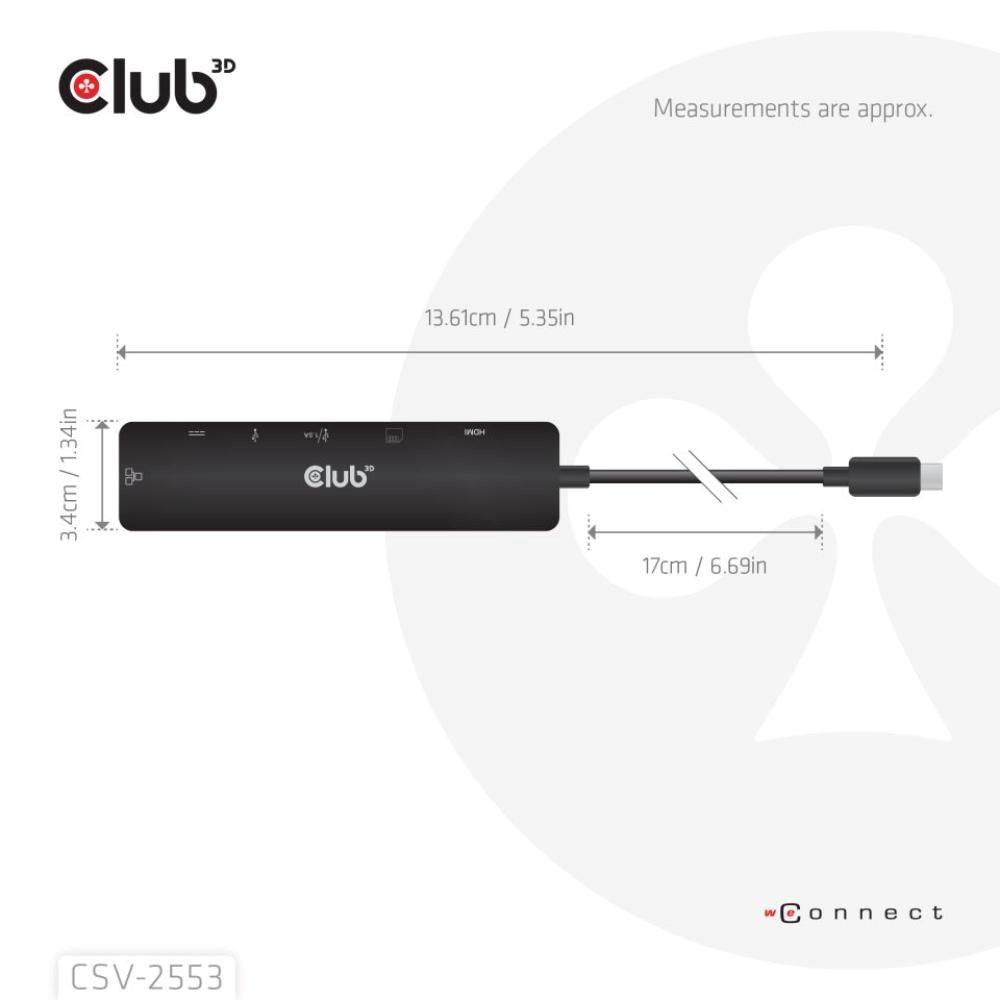 Club 3D CSV-2553 je USB-C, rozbočovač 7 v 1 s HDMI, 2x USB, RJ45, slotmi pre karty microSD/SD a portom USB-C samice, ktorý predstavuje ideálne riešenie na rozšírenie USB-C alebo Thunderbolt 3 (PC/laptop/tablet/mobilný telefón atď.) špeciálne pre hostiteľov s jediným portom USB-C.
