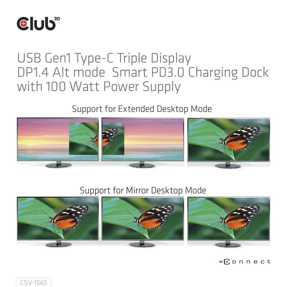 Club 3D CSV-1568 USB Gen2 Type-C Triple Display DP™ Alt mode + Smart PD Charging Dock so 120 W PSU je integrované riešenie, ktoré kombinuje video, dáta, napájanie, ethernet a zvuk. Má 4 videá (výstup 3 videí súčasne v režime MST) na prenos videa, 4 dátové porty USB (2 USB-A 10G, 1 Type-C 10G, 1 USB-A 5G) na prenos dát, 1 inteligentný nabíjací port USB-A na rýchle nabíjanie, 1 gigabitový ethernetový port na superrýchly ethernet, 2 audio porty (3.5 mm audio, Toslink) na počúvanie hudby. Okrem toho je táto dokovacia stanica vybavená dvojitým napájacím konektorom (nabíjanie PD typu C alebo 120W jednosmerný zdroj).