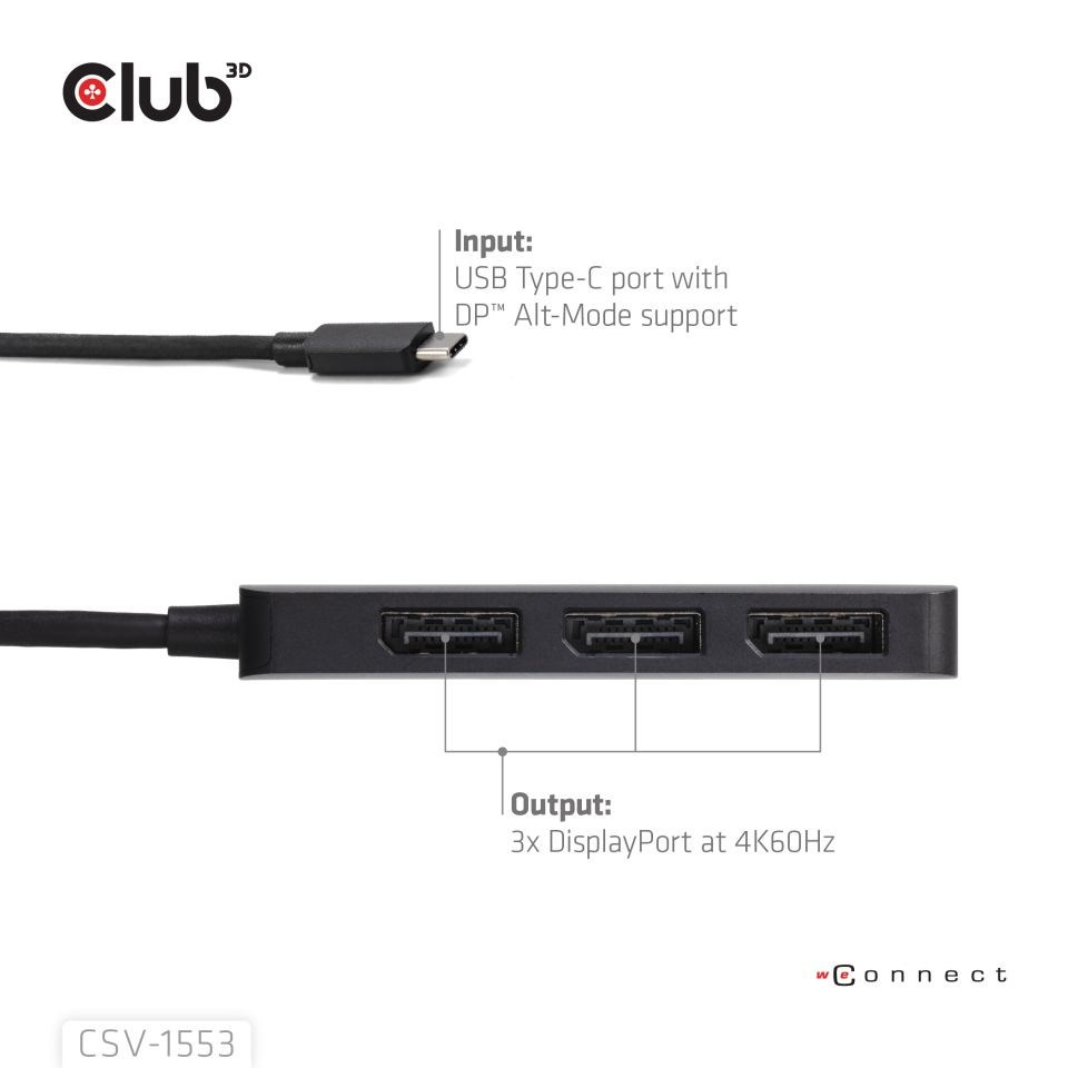CSV-1553 je rozbočovač MST pre DisplayPort™. Tento rozbočovač USB-C MST je navrhnutý tak, aby vyhovoval vašim najvšestrannejším požiadavkám na pripojenie, ako je mobilný telefón, tablet, notebook atď. s výstupom USB-C, ktorý podporuje režim DP™ Alt-Mode ako hostiteľ pre 3 porty DisplayPort s podporou ultra vysokého rozlíšenia. Podporuje DP2.1 AltMode a umožní vám výstup jedného displeja s maximálnou kapacitou 8K30Hz alebo dvoch displejov s podporou 8K30Hz + 4K144Hz alebo trojitých displejov, každý s frekvenciou 4K60Hz. Podporuje všetky zariadenia kompatibilné s rozhraním USB-C alebo Thunderbolt4 s podporou alternatívneho režimu DisplayPort.