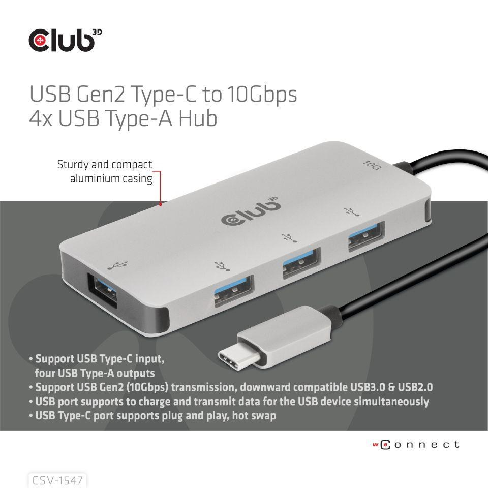 Club 3D CSV-1547 je rozbočovač USB Gen2 typu C na štyri porty USB typu A, ktorý pridáva štyri bežné porty USB typu A k vášmu zariadeniu s rozhraním USB typu C 10G na prenos dát a nabíjanie. Môže fungovať na akomkoľvek hostiteľovi typu C (PC, notebook, tablet, mobilný telefón atď.). Funguje so všetkými hlavnými operačnými systémami.