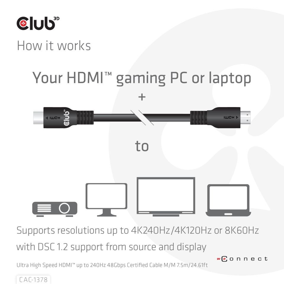 Certifikovaný kábel Club 3D CAC-1378 Ultra High Speed ??HDMI™ je vyrobený tak, aby spracovával video a audio signály najvyššej kvality. Rozšírená šírka pásma HDMI™ 2.1 na 48 Gb/s. Zvýšenie maximálnej šírky pásma v porovnaní s predchádzajúcimi verziami je dosiahnuté zvýšením bitovej rýchlosti dátových kanálov (z 6 Gb/s na 12 Gb/s) a počtu kanálov (zo 3 na 4). To umožňuje podporu rozlíšenia až do 4K120Hz alebo 8K60Hz! Nová funkcia obsiahnutá v tejto špecifikácii je Display Stream Compression (DSC) 1.2, používa sa pre video formáty vyššie než 8K s pomerom strán 4:2:0.
