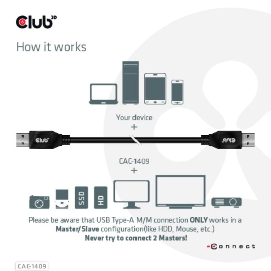 Kábel Club 3D CAC-1409 USB Typ-A Gen2(10G), 3A M/M je USB Typ-A kábel s dĺžkou 0,5 m. Je kompatibilný s USB 3.1 Gen 2 s maximálnou rýchlosťou 10 Gb/s prenosu dát a podporuje až 15W nasledovného nabíjania. Je spätne kompatibilný s nižšími verziami, prosím, majte na pamäti, že špecifikácie budú obmedzené na pripojené zariadenie.