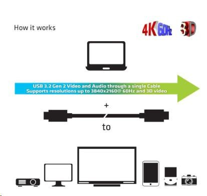 Táto funkcia zabezpečuje optimálny výkon medzi pripojenými zariadeniami. Podporuje až 4K 60Hz UHD video. Video vyžaduje, aby hostiteľské zariadenie podporovalo režim DisplayPort™ Alt.