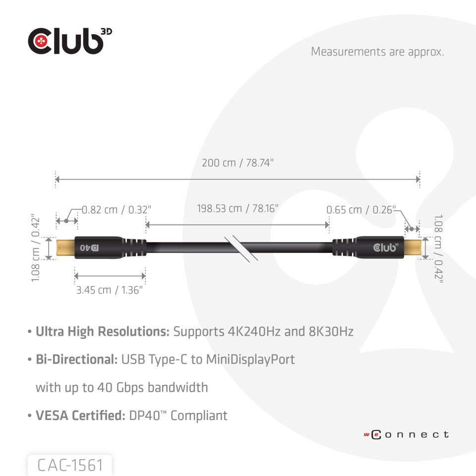Club 3D CAC-1561 USB-C na MiniDisplayPort™ 2.1 obousmerný DP40™ koaxiálny kábel, 4K240Hz, 8K30Hz 2m umožňuje pripojenie vášho (herných) PC alebo notebooku k monitoru s Ultra vysokým rozlíšením alebo inému zariadeniu s podporou MiniDisplayPort™.