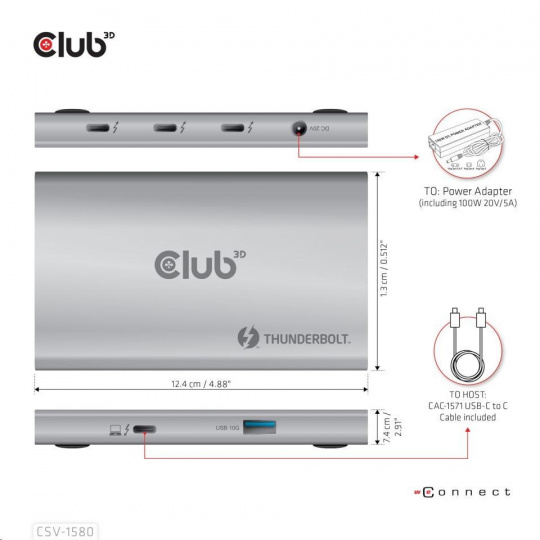 Club 3D CSV-1580 je certifikovaný prenosný rozbočovač Thunderbolt™ 4, ktorý poskytuje najpokročilejšie, najefektívnejšie a najvšestrannejšie dostupné I/O riešenie s rýchlosťou až 40 Gb/s pre dáta a video. Tento moderný rozbočovač Thunderbolt™ 4 má po prvýkrát 3 nadväzujúce porty Thunderbolt™ 4, ktoré umožňujú kaskádové pripojenie zariadení Thunderbolt™ 4 k jednému 8K30Hz alebo dvom 4K60Hz monitorom, možno ho tiež ľahko pripojiť k akémukoľvek zariadeniu USB typu C a súčasne nabíjať počítač. Okrem toho podporuje funkciu Smart Power, ktorá umožňuje rozdeľovať energiu podľa spotreby pripojeného zariadenia a plne tak využívať externý zdroj napájania. Je určený pre počítače PC s rozhraním Thunderbolt™ 4 a počítače Mac™ s rozhraním Thunderbolt™ 3, ktoré používajú systém macOS™ 11 a novšie verzie.