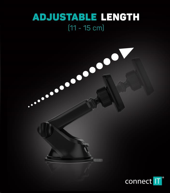 - Nastaviteľná dĺžka ramena od 11 do 15 cm, aby vyhovovala aj veľmi šikmým čelným sklám alebo atypickým prístrojovým doskám