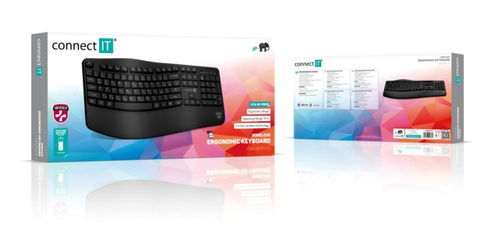Klávesnice kromě klasických funkcí disponuje 12 multimediálními a funkčními klávesami, které se obzvláště hodí do kancelářského prostředí. Příjemný ergonomický náklon klávesnice pomáhá proti únavě zápěstí během dlouhých pracovních relacích. Samozřejmostí je jeden nano přijímač, který má dosah až 10 metrů. V balení je dodáváná originál CONNECT IT alkalická baterie (1x AA).