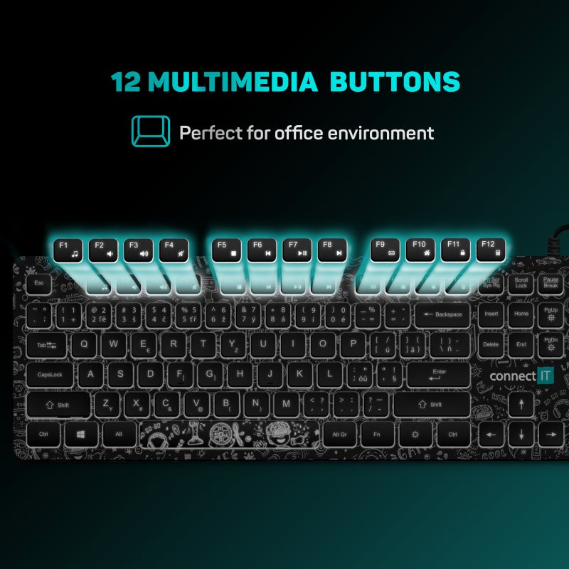 CONNECT IT DOODLE kancelářská drátová bíle podsvícená USB klávesnice, CZ + SK verze, ČERNÁ