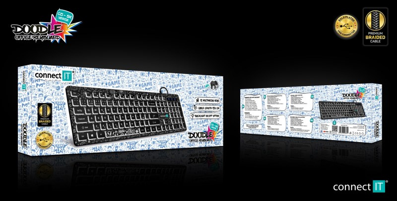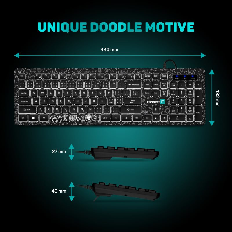Podsvietená klávesnica s unikátnym DOODLE motívom, určená na domáce použitie aj na vysoko záťažové profesionálne použitie v kanceláriách a firmách.