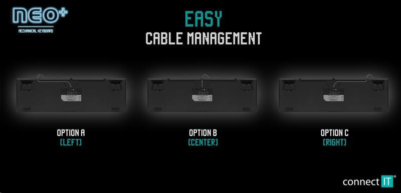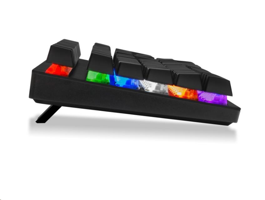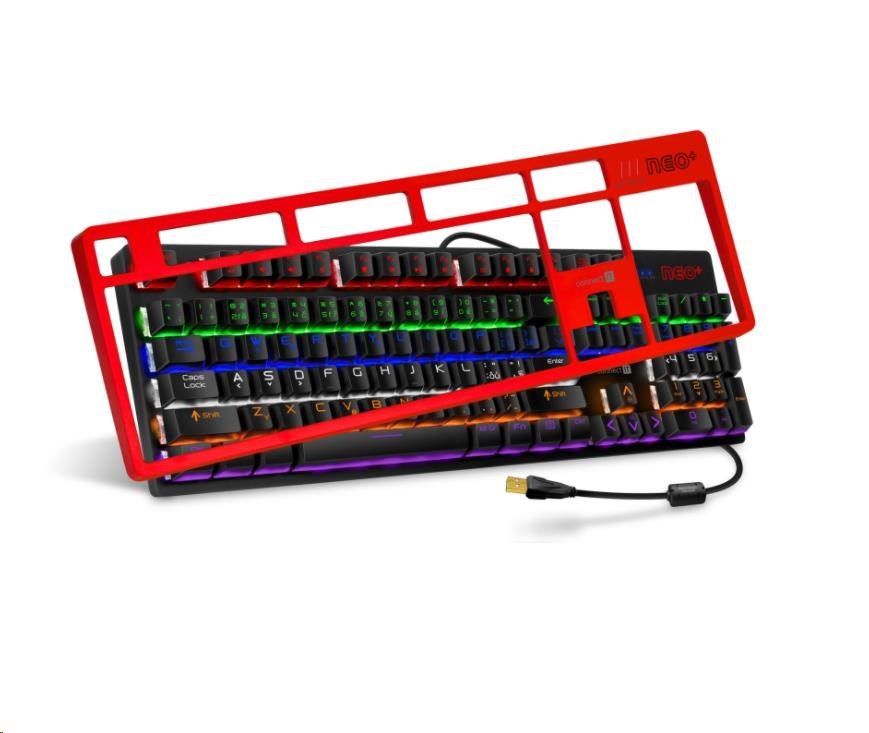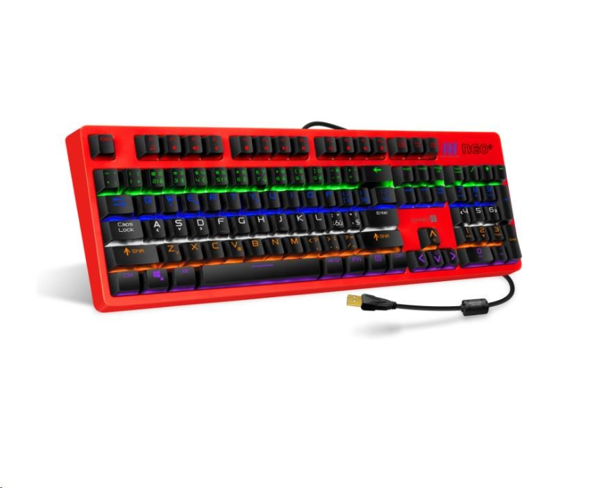 Profesionálna mechanická klávesnica radu NEO+ pre hráčov počítačových hier v českom a slovenskom rozložení s celkom 22 režimami farebného dúhového podsvietenia a päťstupňovou reguláciou intenzity podsvietenia. K dispozícii je 12 multimediálnych tlačidiel.