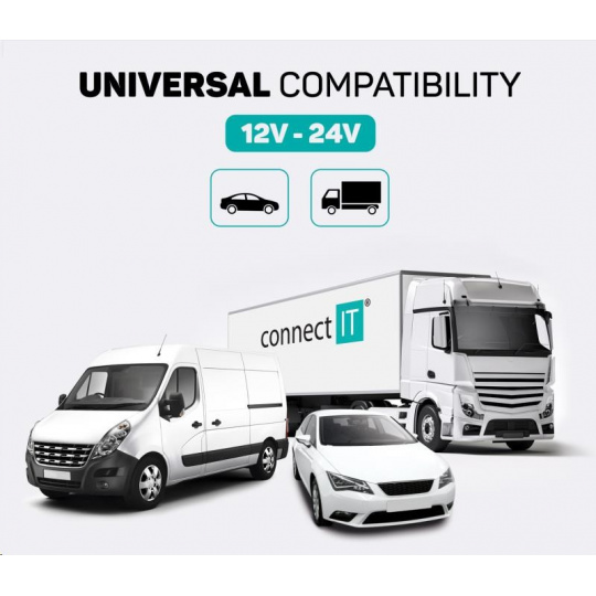 - Kompatibilný so všetkými 12/24 V zásuvkami cigaretového zapaľovača v osobných a nákladných vozidlách