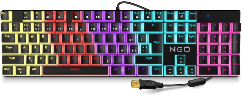 Profesionálna mechanická klávesnica z radu NEO series pre hráčov počítačových hier v českom rozložení s celkom 12 režimami farebného rainbow podsvietenia a štyrmi stupňami regulácie intenzity podsvietenia. K dispozícii je 12 multimediálnych kláves.