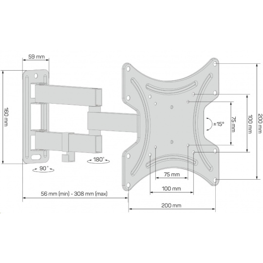 Rozmery držiaka pri maximálnej vzdialenosti od steny (š x v x h): 220 x 220 x 308 mm