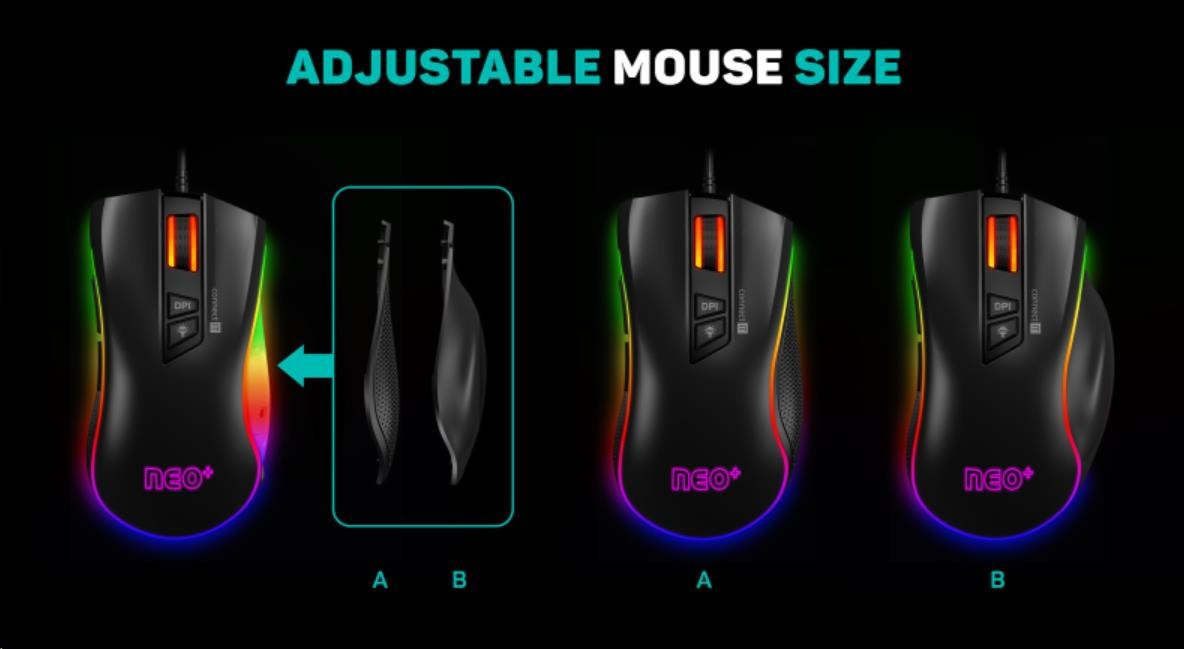 Okrem bežných funkcií je táto myš jedinečná svojou nastaviteľnou veľkosťou s odnímateľným pravým bočným panelom. Takto si môžete myš prispôsobiť svojim potrebám. Časť myši je pokrytá povrchom "honeycomb grip" pre stabilnejší a pevnejší úchop aj počas dlhšieho hrania. Táto myš sa dodáva s hárkom propagačných nálepiek "CONNECT IT NEO" a softvérom, ktorý je k dispozícii na bezplatné stiahnutie na adrese www.connectit-europe.com. Táto séria je samozrejme vybavená prémiovým opleteným napájacím káblom a pozláteným konektorom USB.