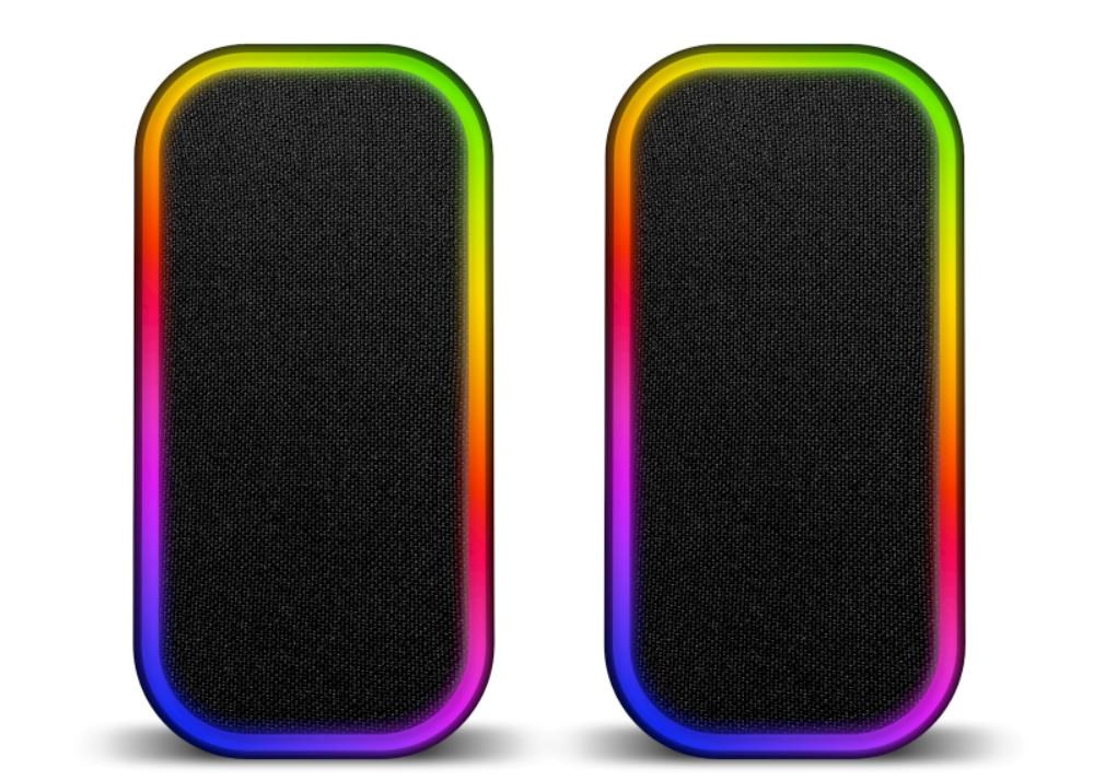 Reproduktory sú vybavené RGB Rainbow podsvietením a ovládaním hlasitosti/podsvietenia/vstupu na kábli.