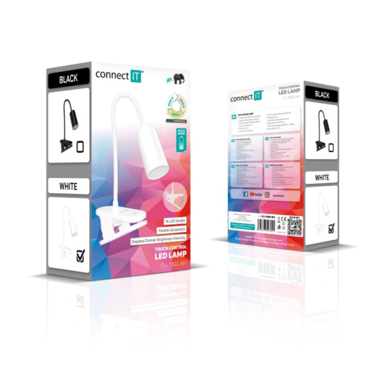 Díky flexibilnímu rameni nastavíte dokonalý úhel pro jakoukoliv práci. Lampička disponuje praktickým dotykovým spínačem, který umožňuje zapnout/vypnout lampu, plynule nastavit úroveň jasu světla nebo nastavit barevnou teplotu světla ve 3 různých úrovních (3000/4500/6500 K). Pomocí klipu můžete lampičku umístit nejen na Váš pracovní stůl, ale například na poličku, noční stolek či rám postele.