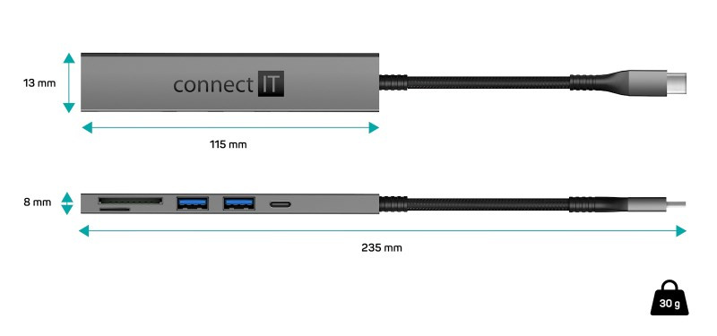 Prakticky tvarovaný USB-C hub pre pripojenie až 3 USB periférií (1 x USB-C a 2 x USB-A), 1x SD karty a 1x MicroSD karty. Umožní pripojenie napr. myši, klávesnice, MP3 prehrávača, skenera, tlačiarne, digitálneho fotoaparátu, externého pevného disku, flashdisku atď.